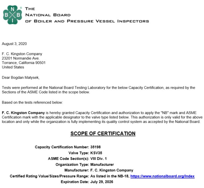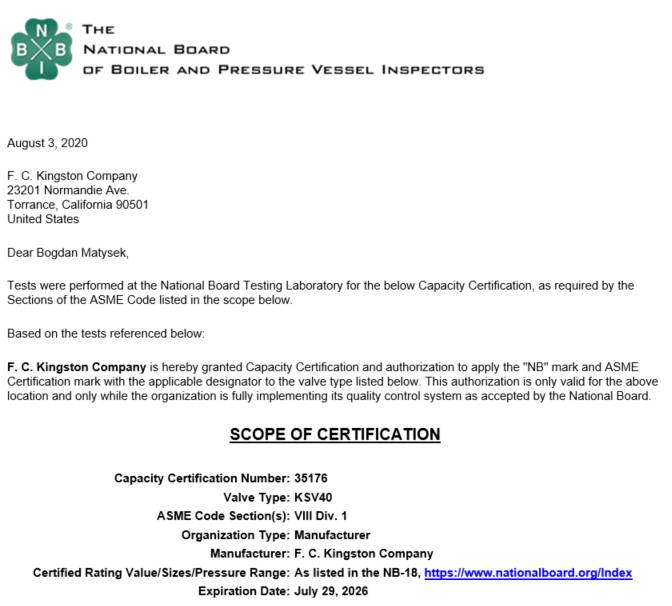 KINGSTON VALVES CERTIFICATIONS